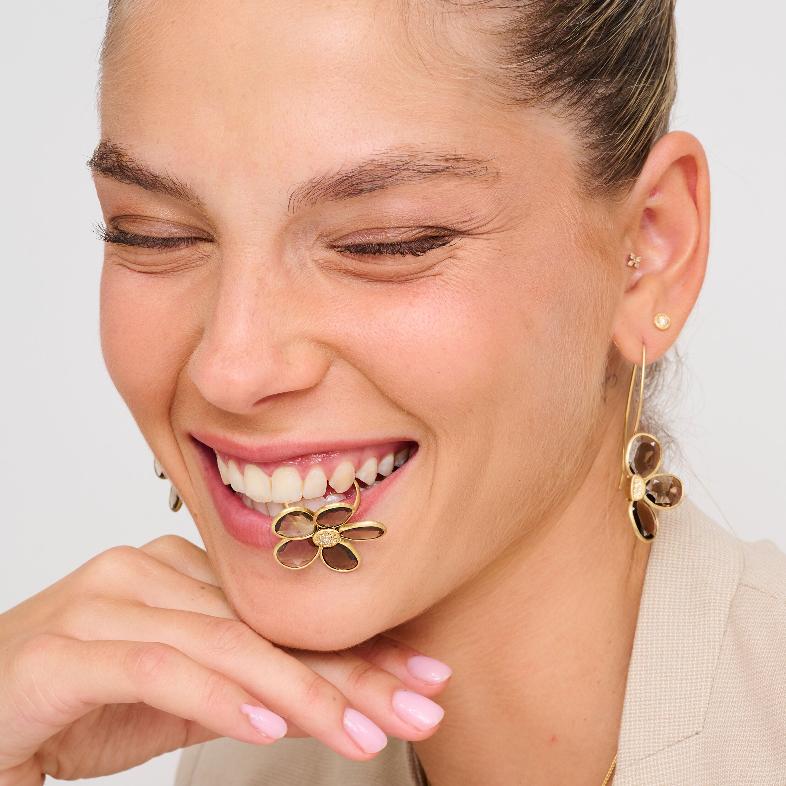 The Bloom Drop Earrings captivate with their exquisite design, showcasing two elegant halves that gracefully embrace the face, beautifully embodying the essence of nature in a vibrant flower shape. Crafted in 14k gold, each earring showcase three petals of Smoky Topaz gemstone encircling a stunning half-brilliant diamond center, forming a breathtaking focal point that radiates elegance and charm.
