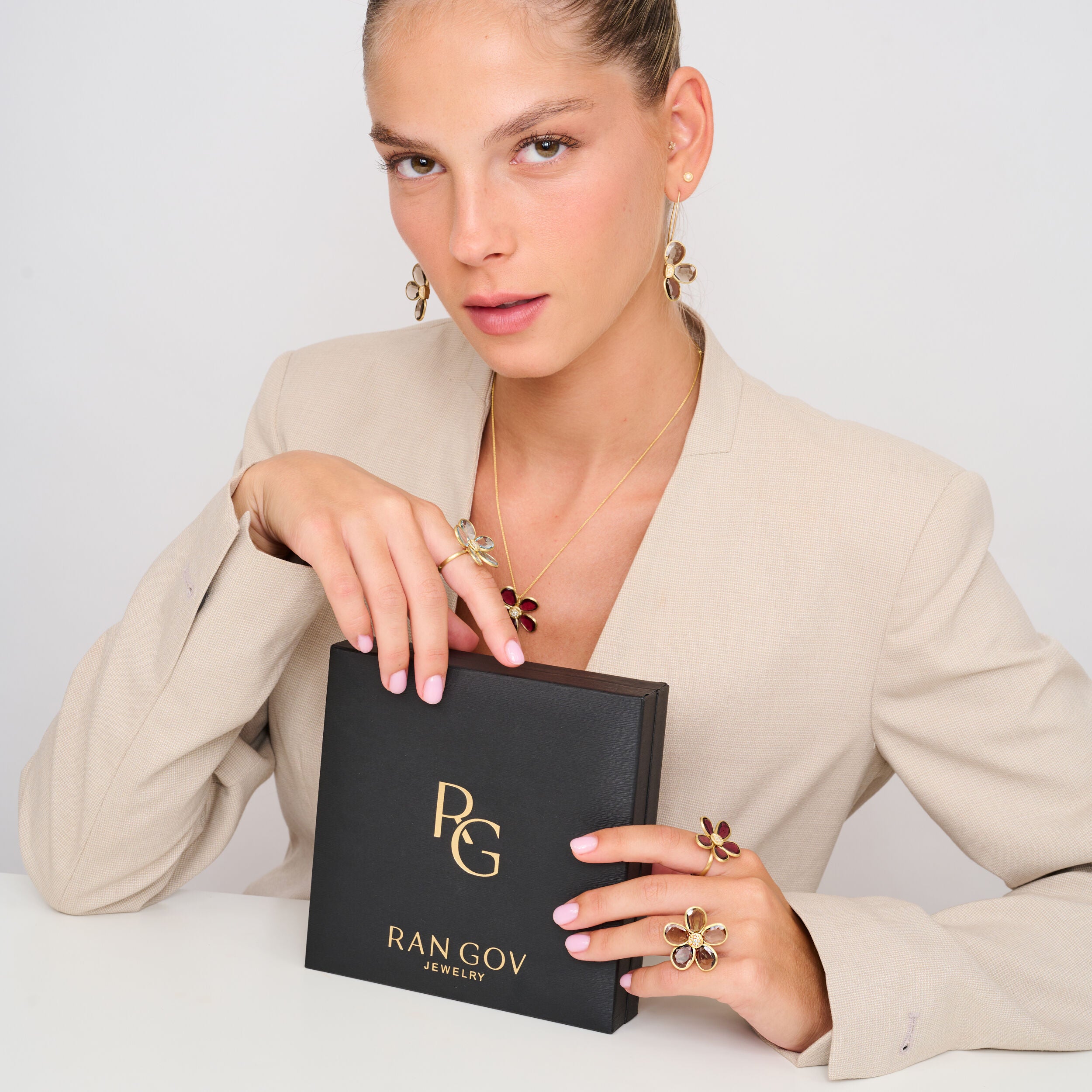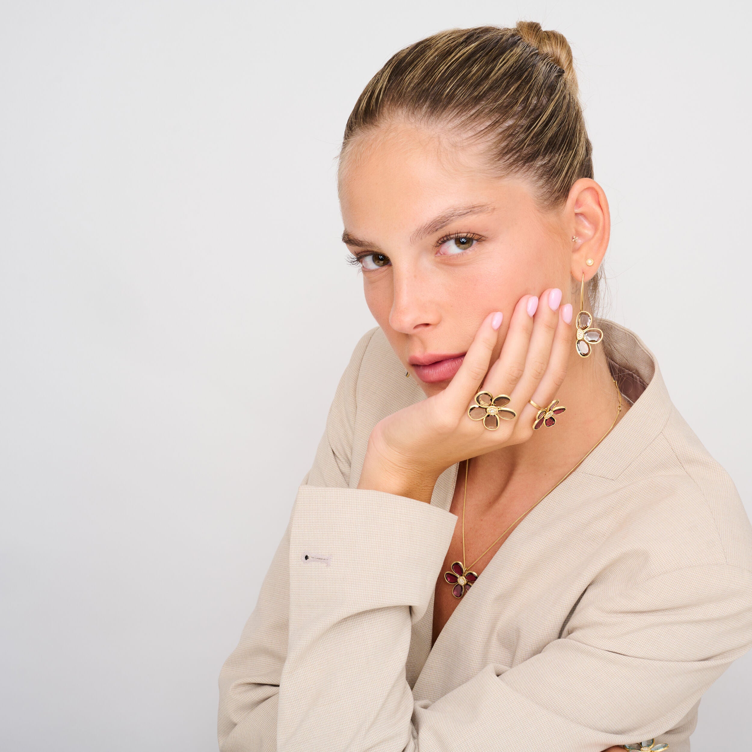 The Bloom Ring mesmerizes with its exquisite design, beautifully embodying the essence of nature in a vibrant flower shape. Crafted in 14k gold, it features five petals of Smoky Topaz Gemstone surrounding a brilliant diamond center, creating a breathtaking centerpiece that radiates elegance and charm.