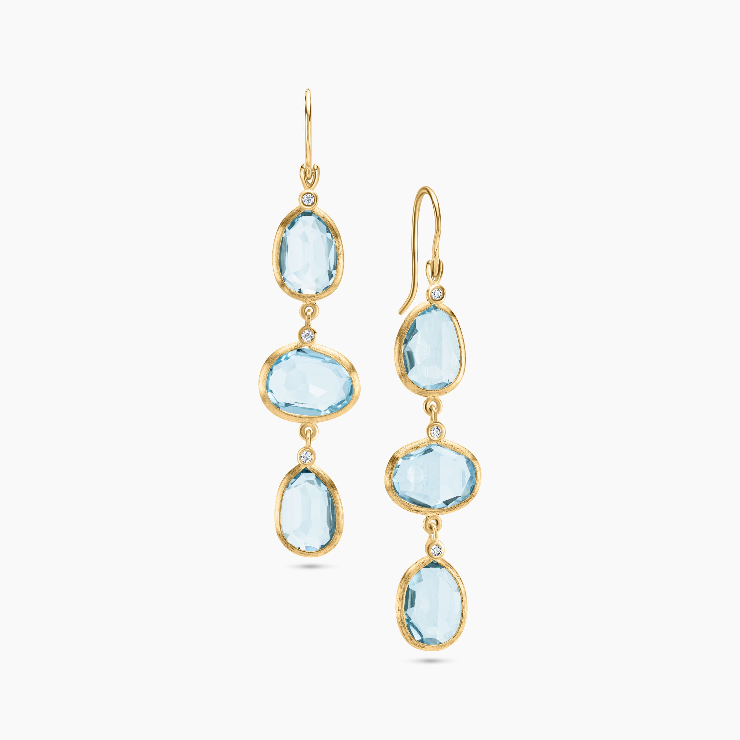 Capturing the graceful charm of water's natural movement, The triple drop Raindrop earrings showcase a cascade of three Free Form Sky Blue Topaz gemstones and decorative diamonds embellished in 14k gold. These earrings embody the fluidity and beauty inspired by nature's rhythmic flow.