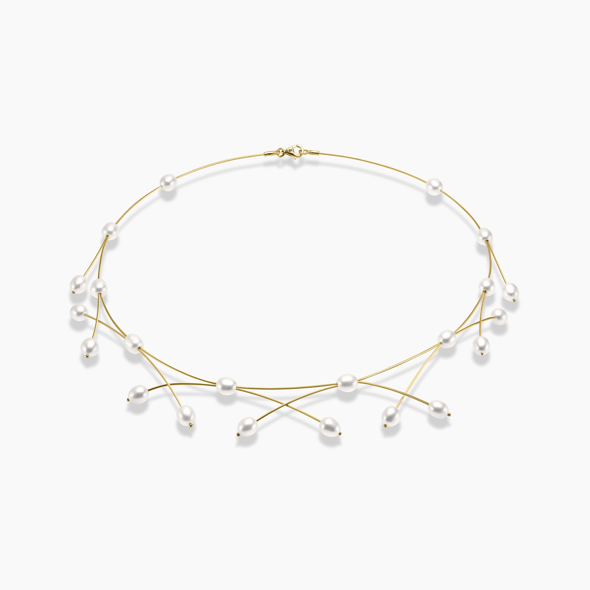 With its show stopping design, this necklace undeniably makes a bold statement. Designed to resemble branches on a tree, white oval pearls dangle from the ends of 14k solid gold flex cable to create a captivating and distinctive design.