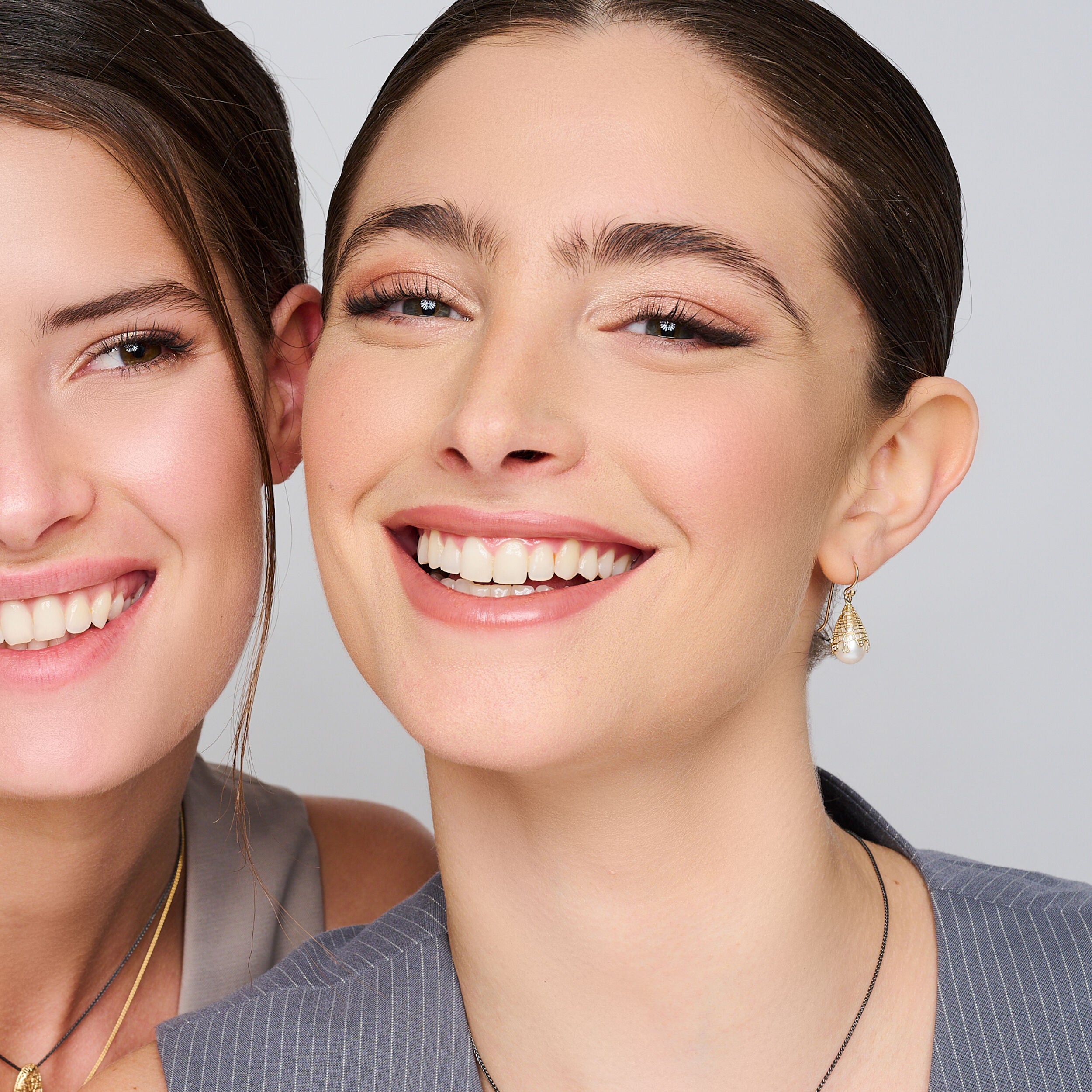 Mixed detailing harmonizes in these drop earrings, where finely threaded 14k gold intertwines with white pearls, crafting a delicate interplay that will undoubtedly enhance any look with sophistication.