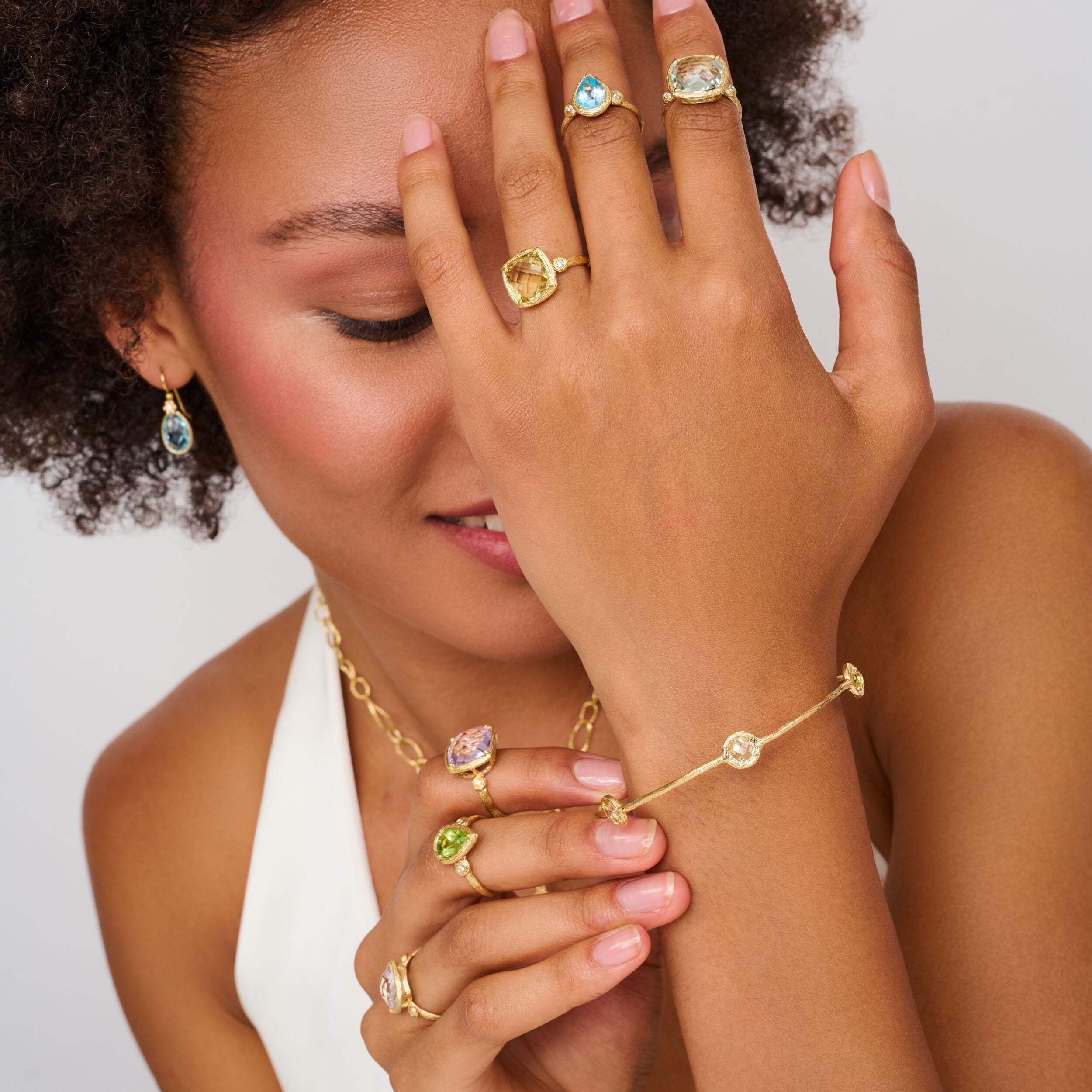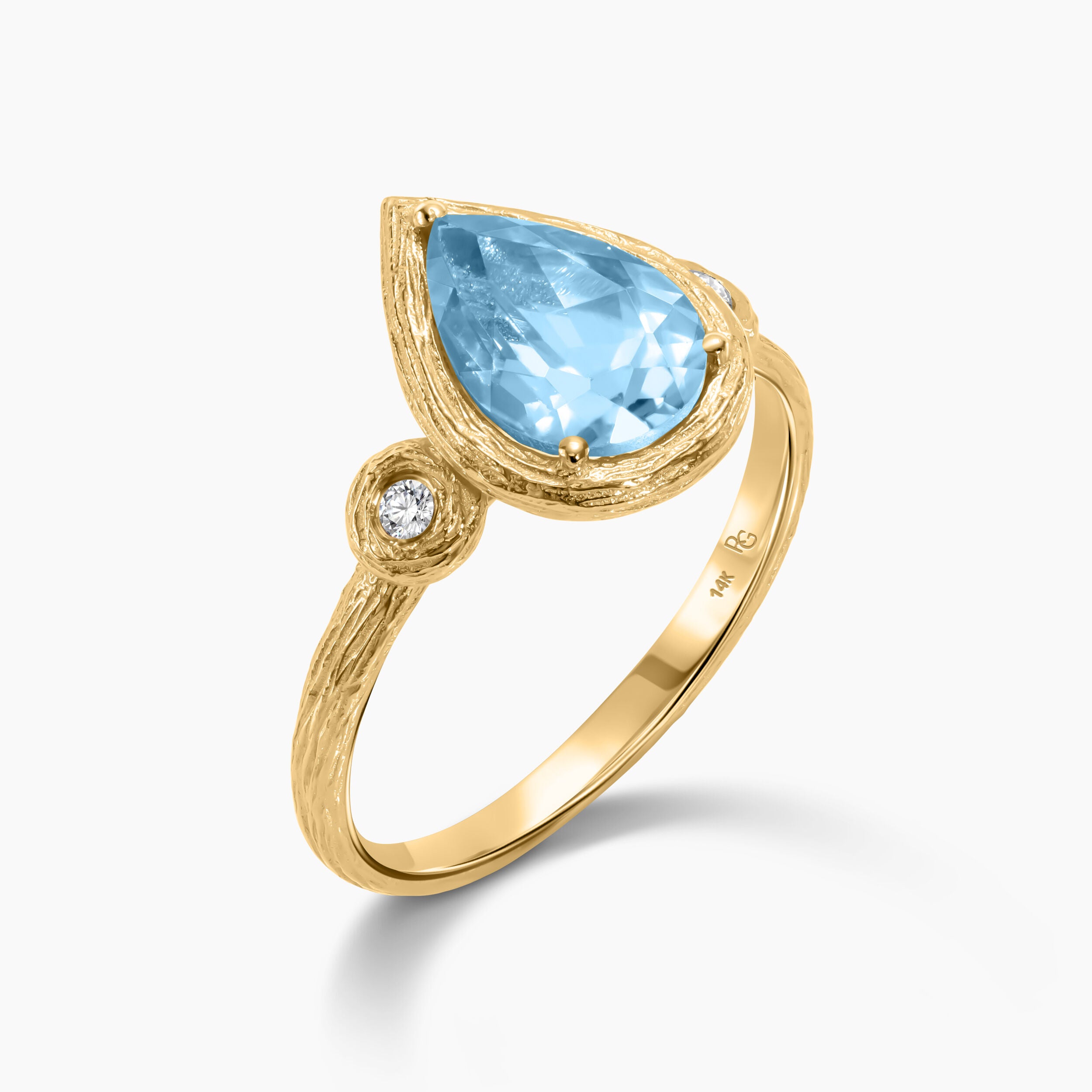 Set in 14k gold, the sky blue ring features a single pear shaped Blue Topaz gemstone bounded by two delicate accent diamonds gently placed on either side. The cool, fresh hues radiate, bringing a sense of harmony to the wearer.