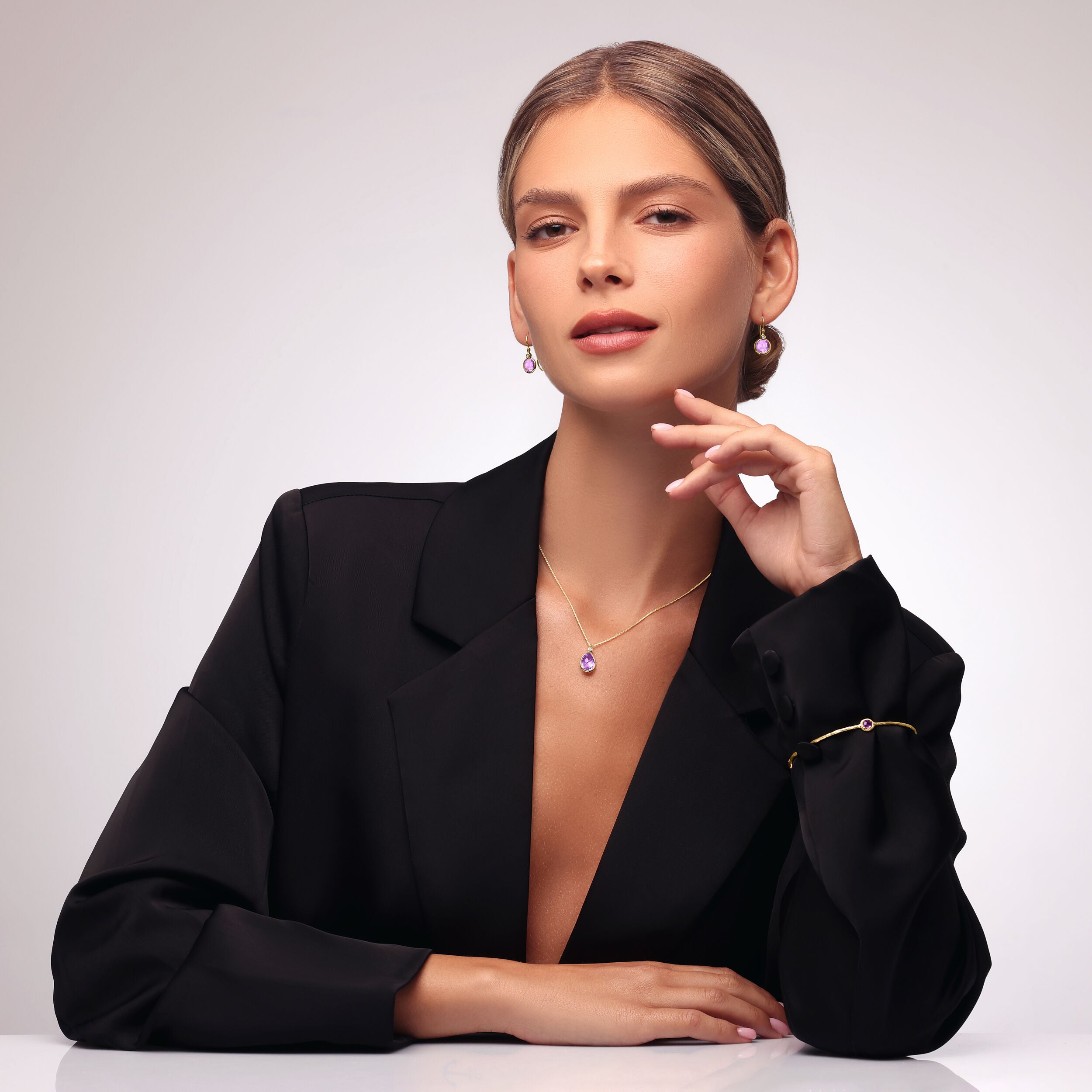 Amethyst necklace features a delicate gold and diamond flower followed by a briolette cut Blue Topaz gemstone. Set in 14k gold, the frosted blue azure creates a piece that effortlessly balances boldness and sophistication