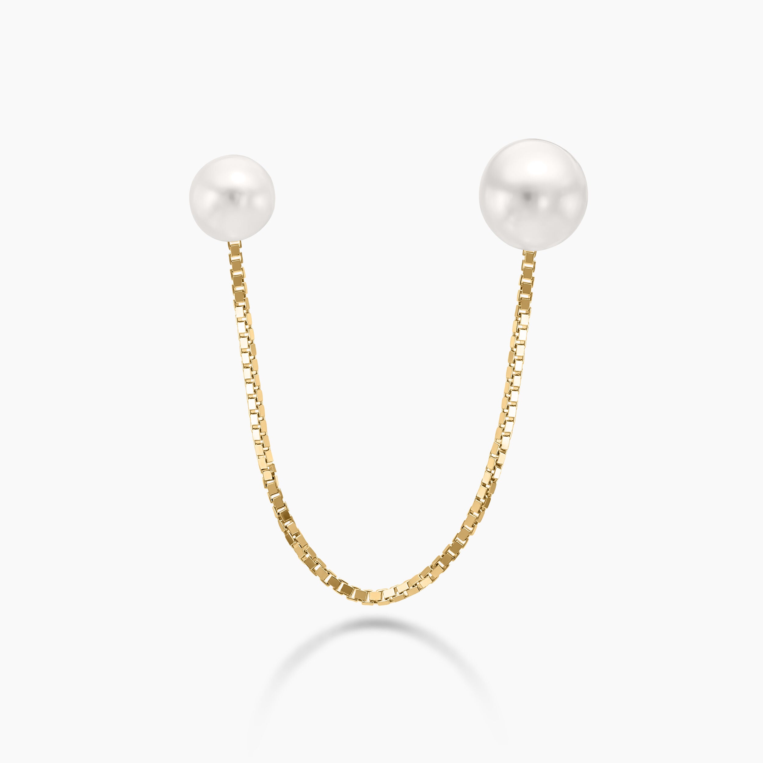 This single earring offers a bold twist on the classic stud design. Featuring two pearl studs delicately connected by a fine chain, adding a modern touch to traditional elegance.This earring is designed specifically for double piercings.