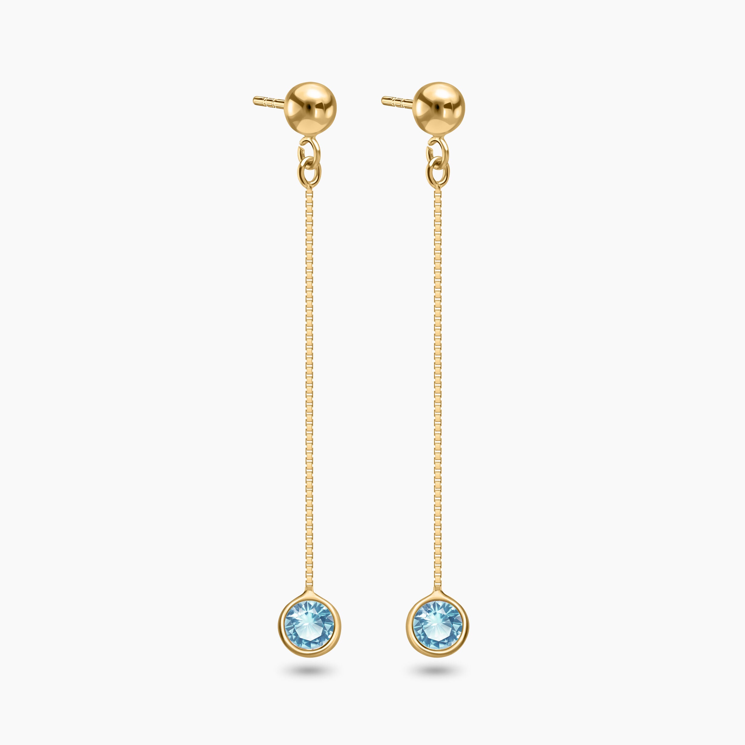 4mm round Blue Topaz Gemstones gently drop from a 14k gold fine chain, perfectly swaying and catching the light with every move.