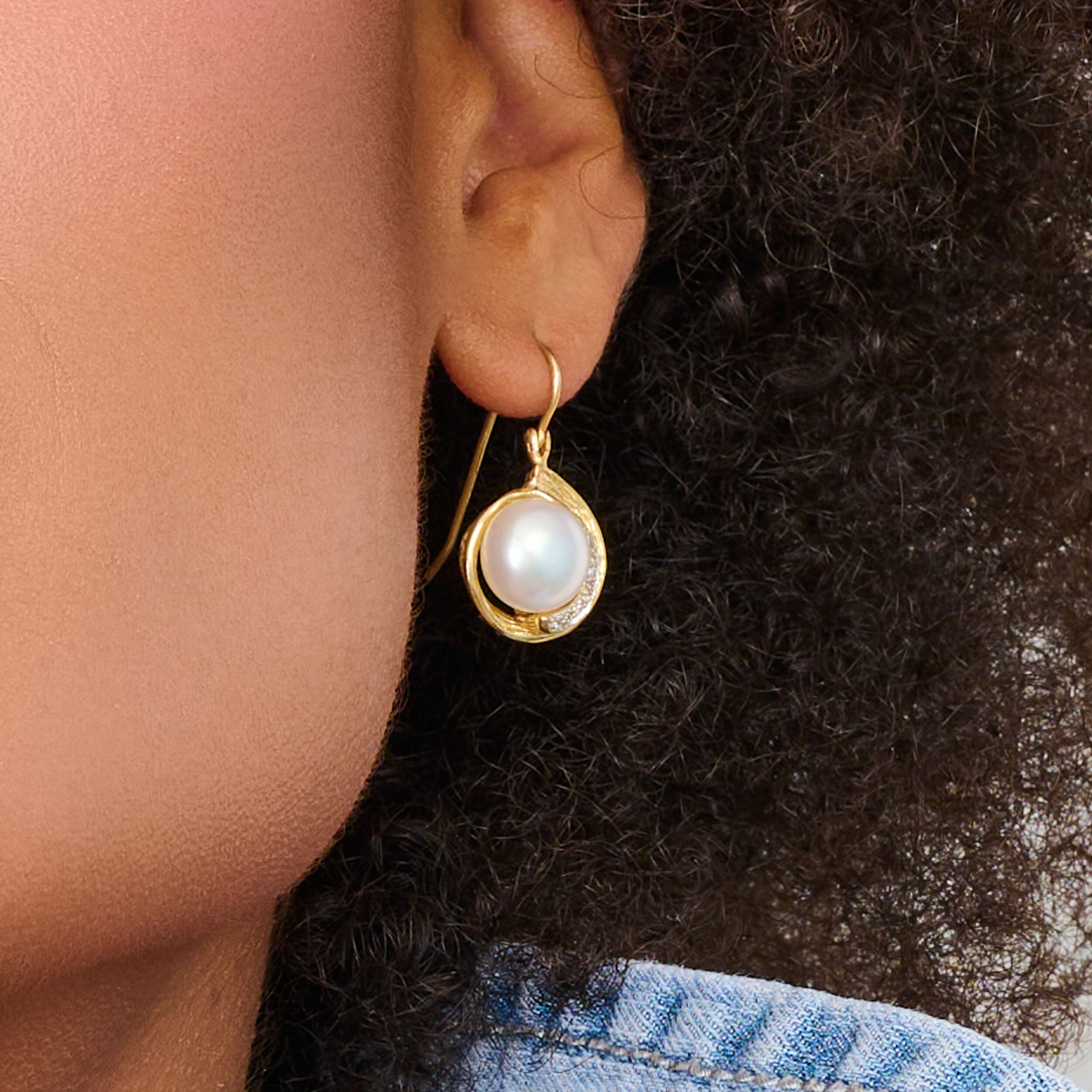 Crafted in 14k solid gold, these drop earrings showcase a lustrous Pearl center stone encircled by a swirl of white diamonds and textured gold forming a stunning halo effect.